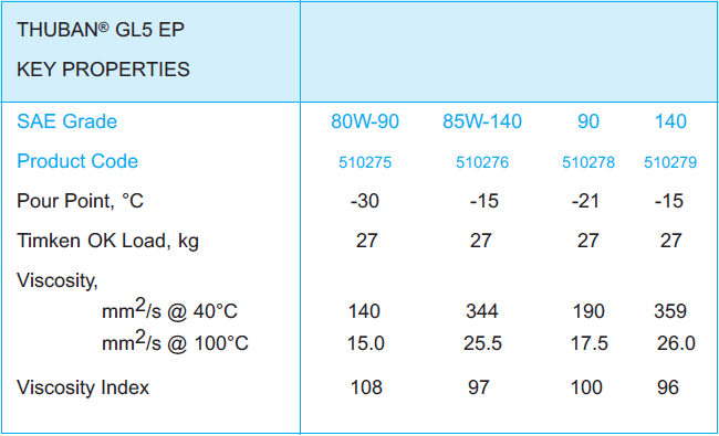 performance, multipurpose, thermally stable, EP automotive gear lubricant. Thuban® GL5 EP has a high vicosity index and low Pour Point assuring good film strength and gear wear protection at both high and low temperatures.