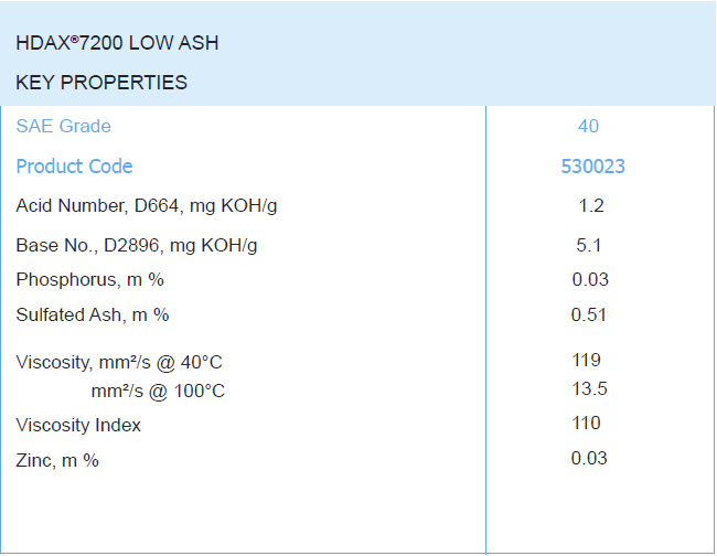 HDAX® 7200 Low Ash Gas Engine Oil is a premium performance, long-drain, heavy-duty, low ash crankcase oil specifically designed to lubricate a wide range of four-stroke natural gas and dual-fuel engines where low ash oils are recommended.